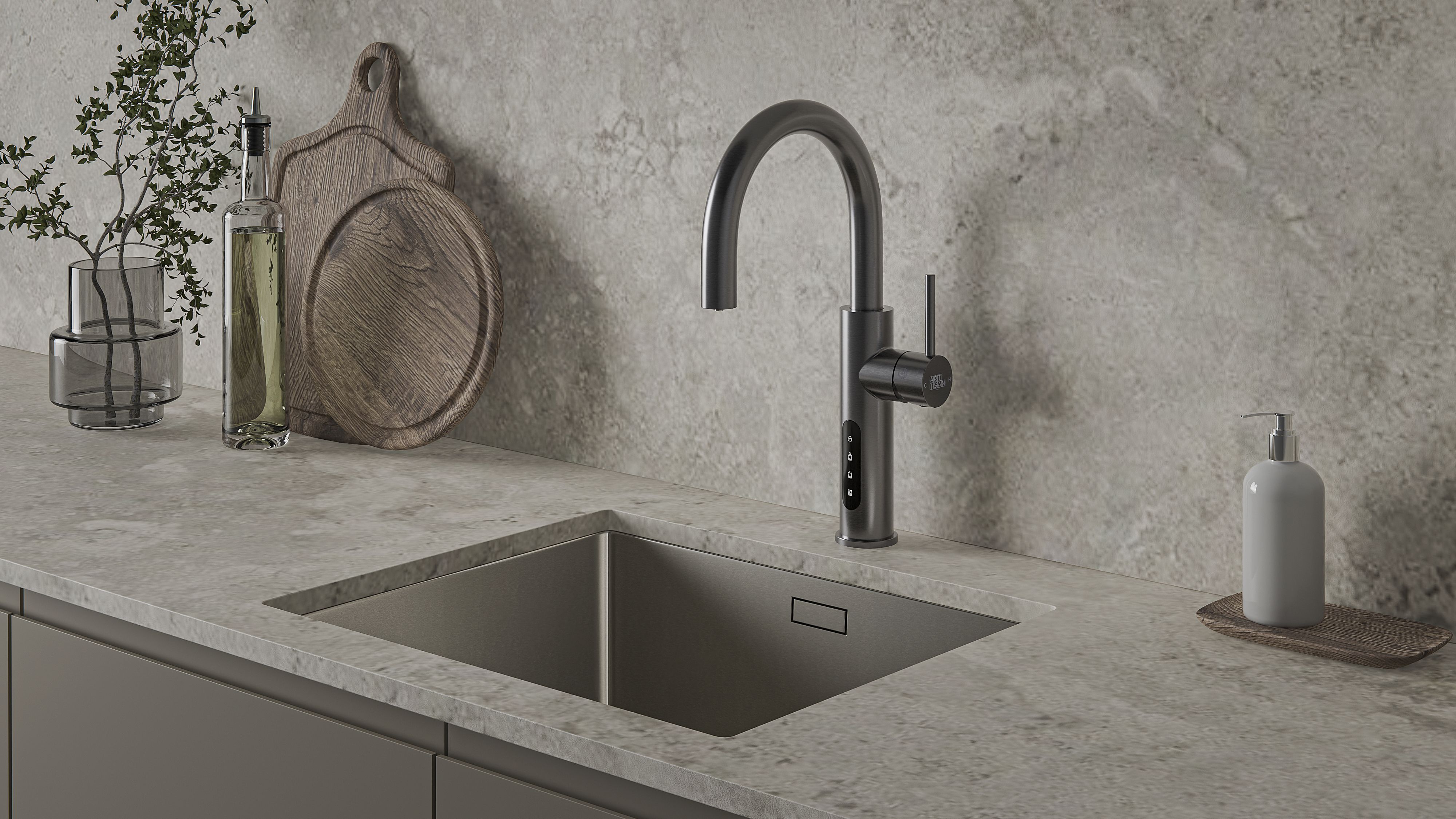 Смеситель готов к подаче фильтрованной охлажденной воды. Коснитесь синей кнопки для непрерывной раздачи воды. Коснитесь её второй раз, чтобы выключить подачу.