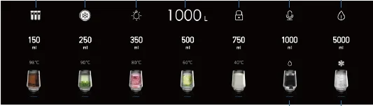 Объём подачи воды (7 режимов): 150 мл/250 мл/350 мл/500 мл/750 мл/1000 мл/5000 мл.
